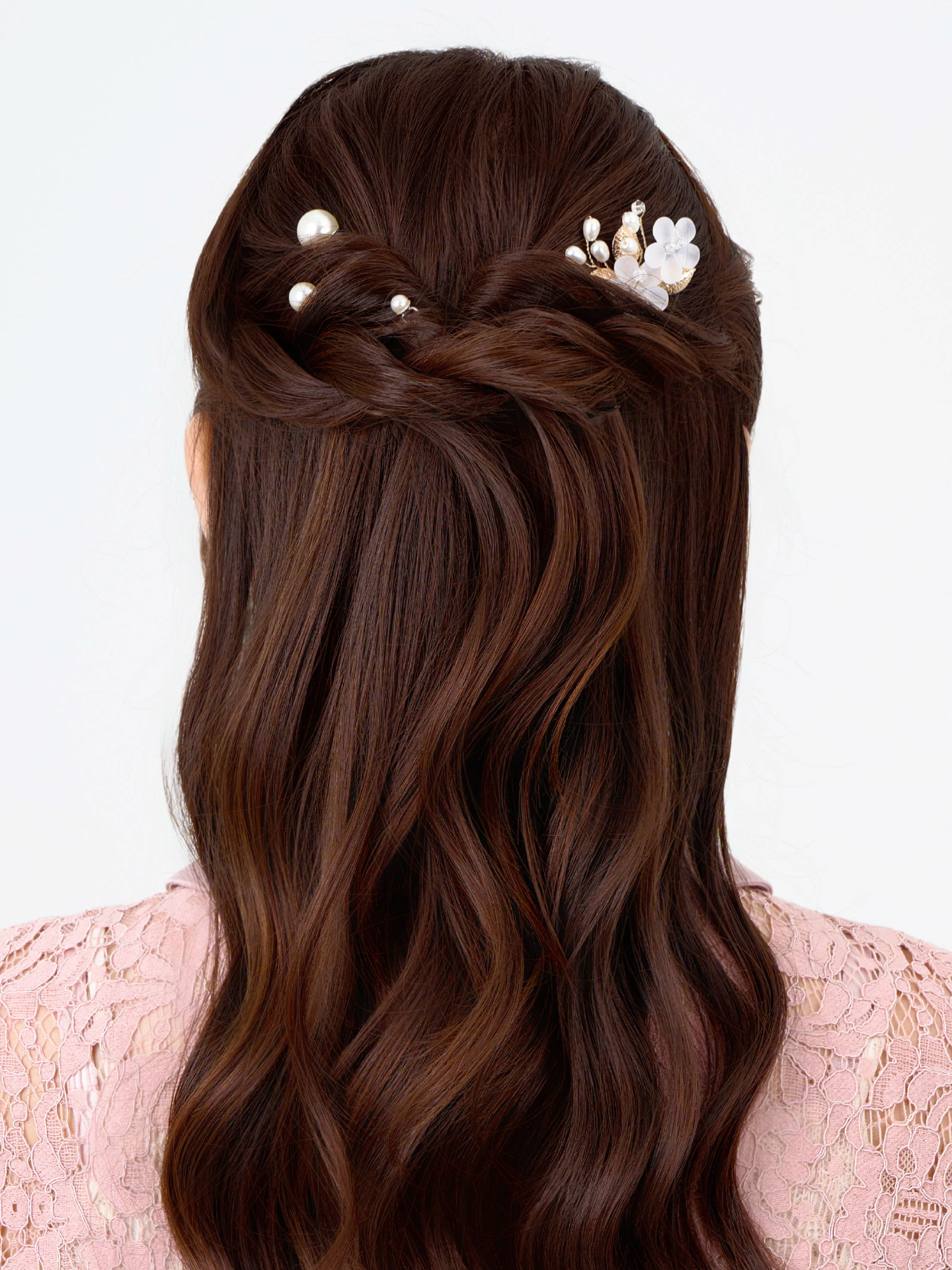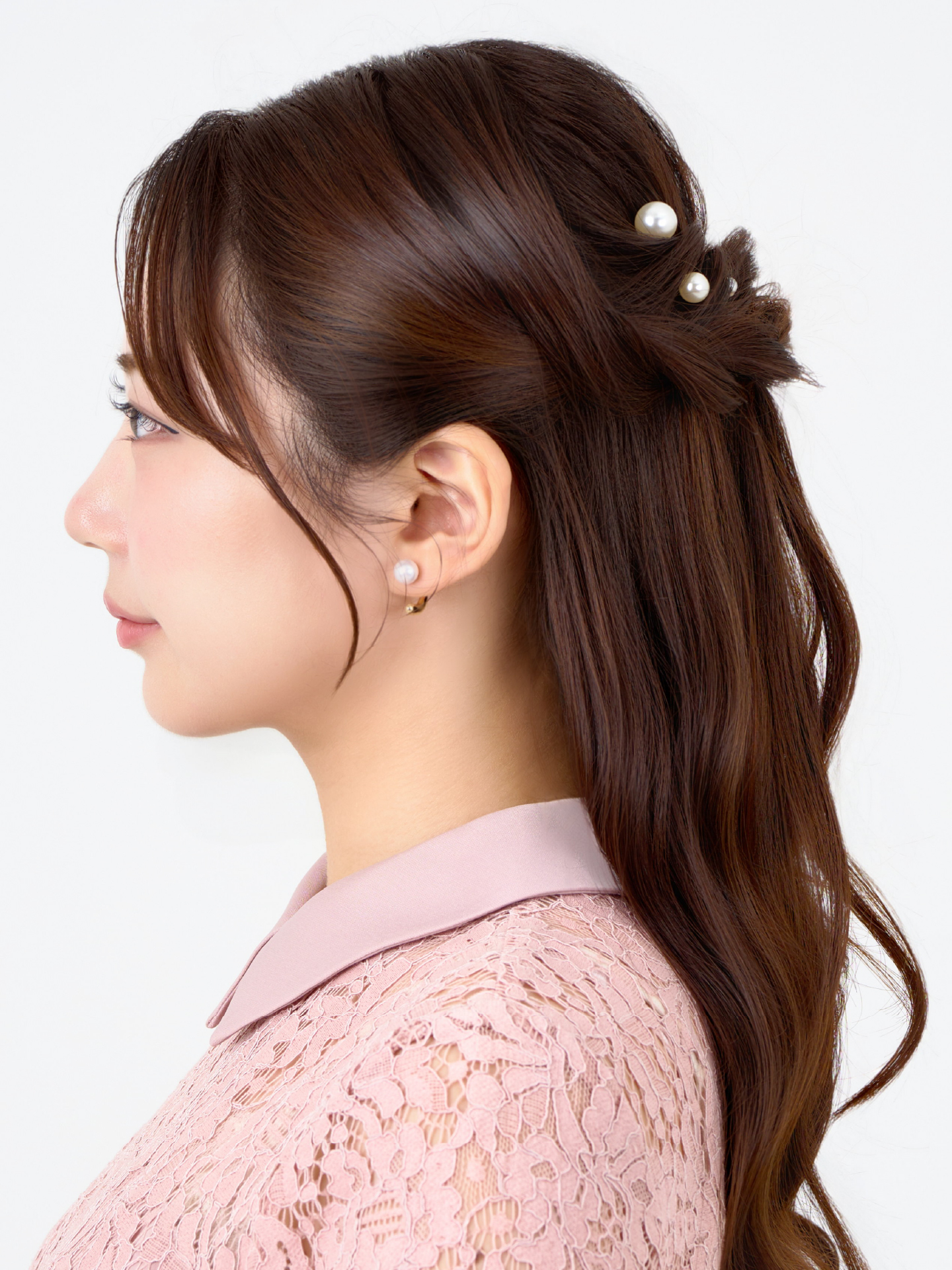 華やかさを引き立てるハーフアップアレンジ。後ろ姿に動きを出しつつ、顔まわりはすっきり見せるスタイルで、結婚式や二次会などパーティシーンにぴったりです◎