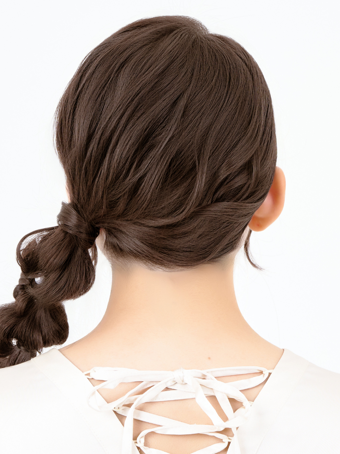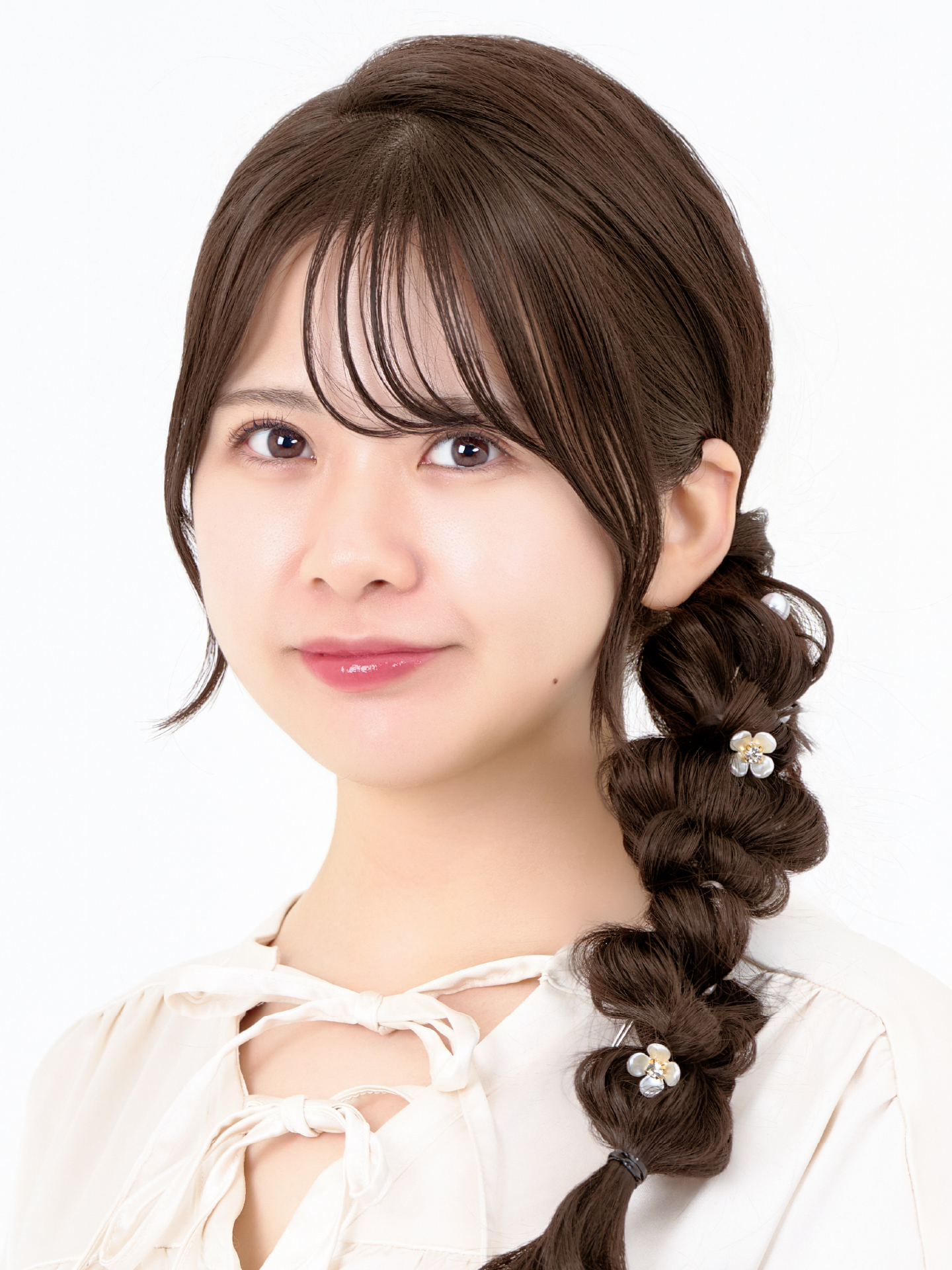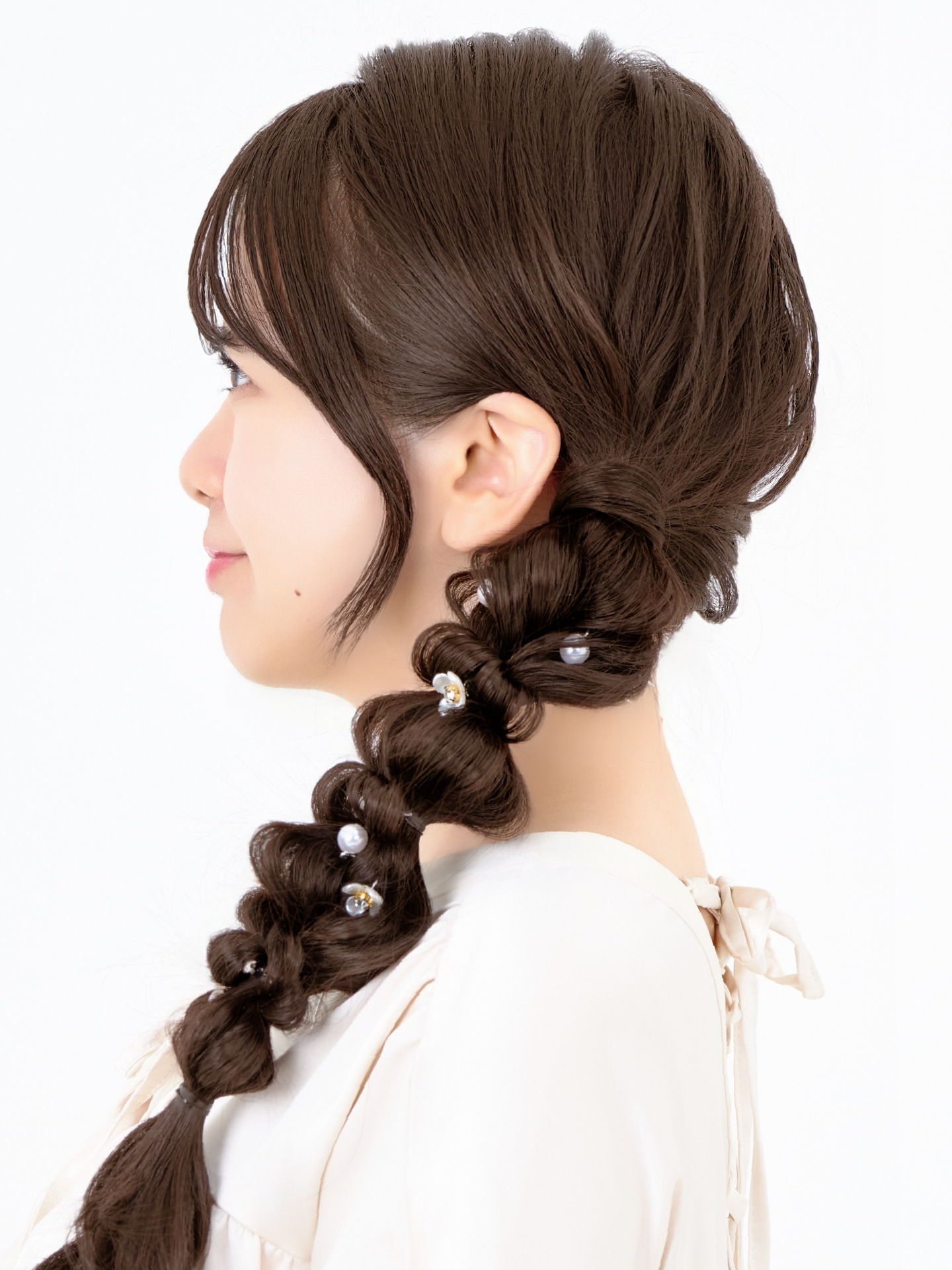 横に流した編み下ろしスタイル。立体感のある編み目がアクセントになり、横顔も華やかに引き立てます。特別なお出かけやイベントにも映えるアレンジです。