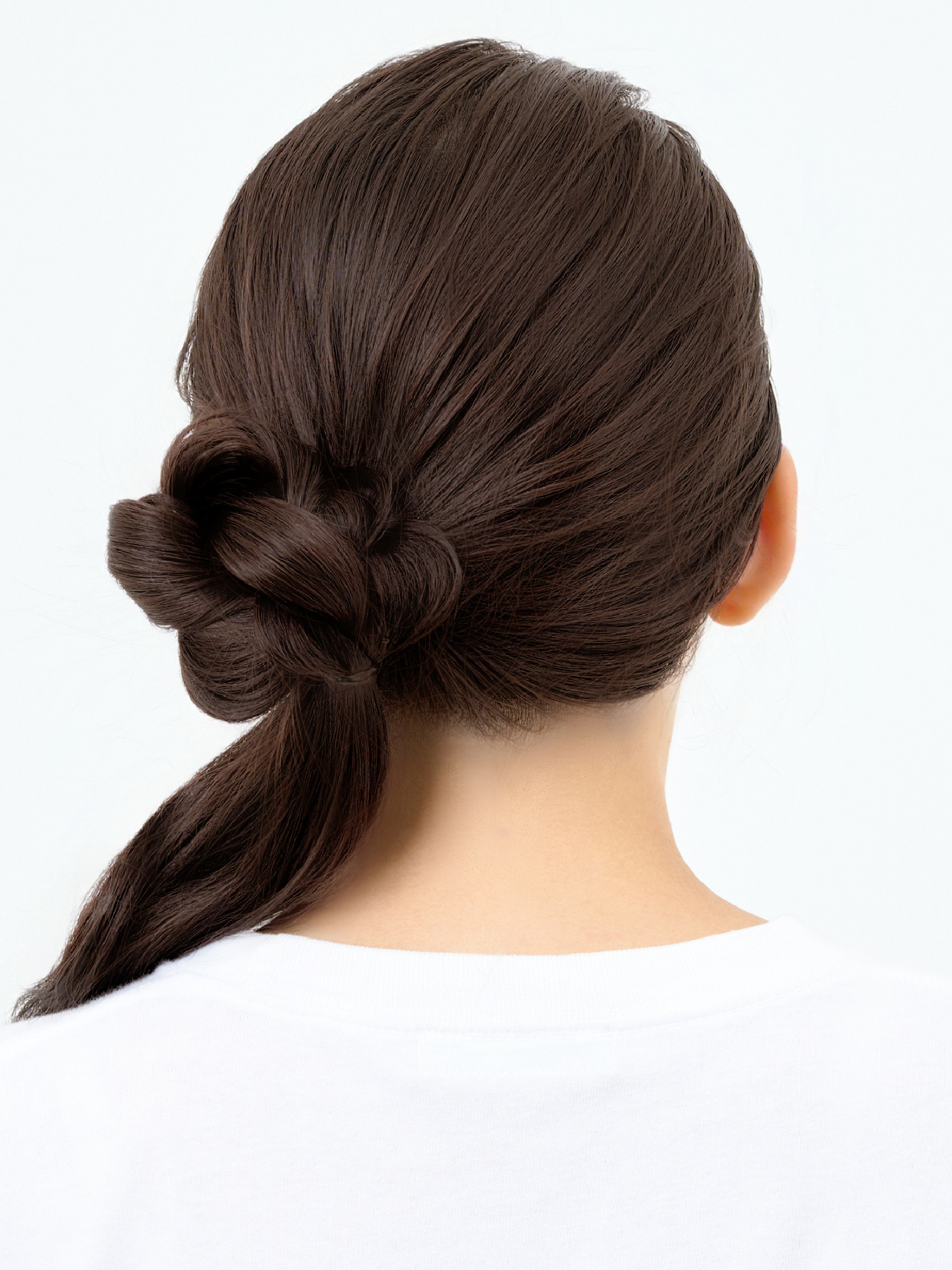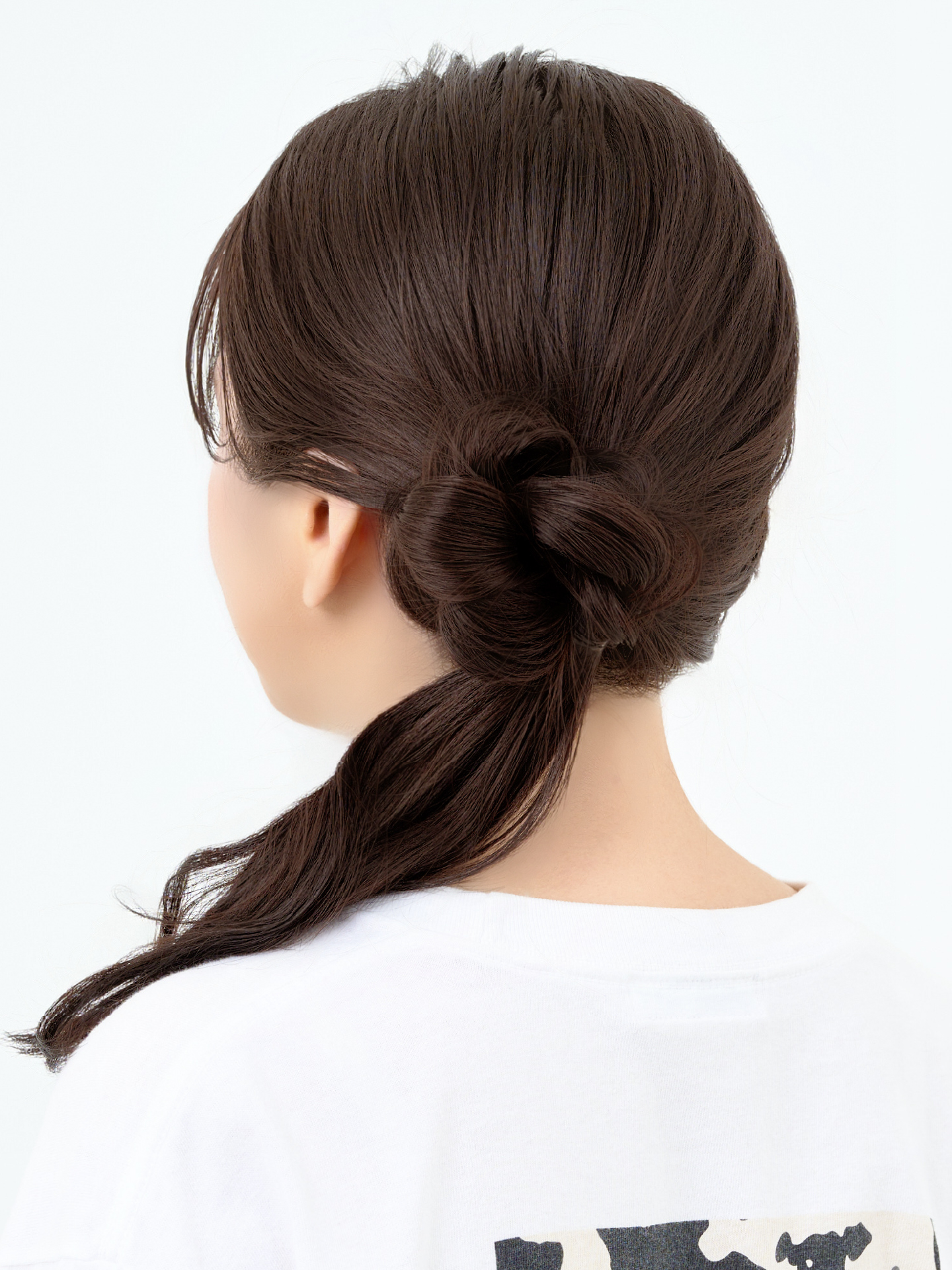 耳後ろでふわふわのお団子を作り、毛先を少し出して軽く巻くことで、カジュアルすぎず洗練された印象に仕上げたスタイルです。可愛らしさと大人っぽさを兼ね備え、イベントやお出かけにもぴったりの万能ヘアです。